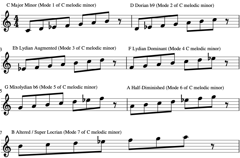 The construction of these modes is identical to that of the major modes (Ionian, Dorian, Mixolydian etc.). You start with your seven-note scale and then you create the seven modes by starting on each of the other notes. The image below shows how you create the modes by using C melodic minor as your initial scale. Once you’ve mastered playing through these, you can then replicate this with the other (ascending) melodic minor scales (C# melodic minor, D melodic minor etc.).