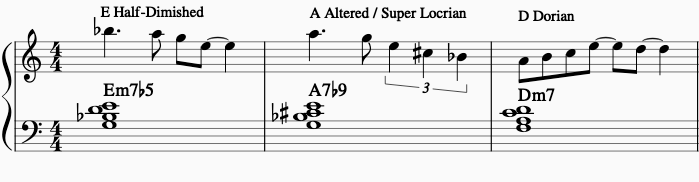 With this now in mind, you may choose to solo over a Em7b5 – A7b9 – Dm7 as such: