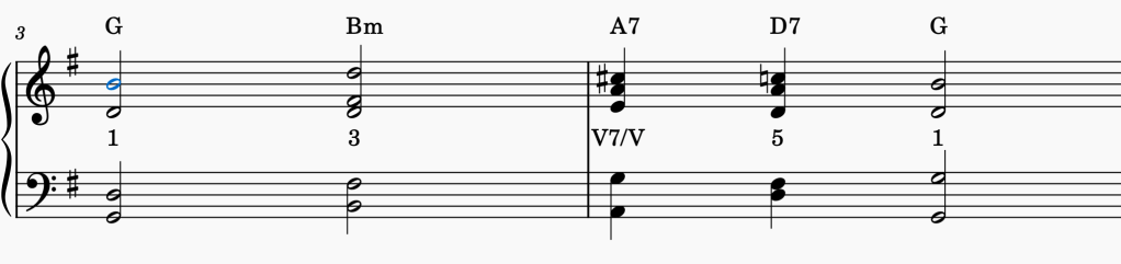 The first thing you’ll notice is the A7 chord, which does not belong in the key of G major. But it does exist in the key of D major—and as you can probably guess, A is the fifth chord in D major! What we’re doing here is using the V7 chord of D major (A7) to lead us toward D (V in G major). This is why it’s called a V7 of V. We’re writing this as roman numerals as this is the common tradition, but you can say it as ‘5 (7) of 5’