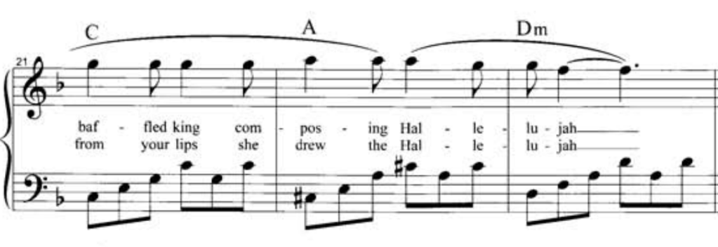 Hallelujah by Leonard Cohen (key: F major) – The A (V7/vi) to Dm (vi) movement.