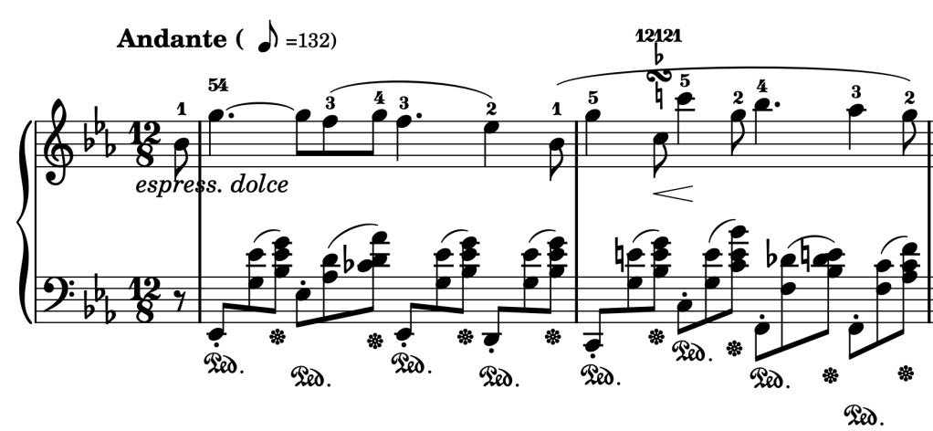 Nocturne Op.9 No.2 by Chopin (key: Eb major) – Bar 2, movement from C7 (V7 of ii) to Fm (ii).