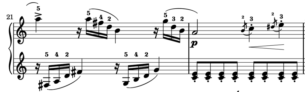 Sonata in C Major by Mozart (key: C major) – Bar 21, movement from D7 (V7 of V) to G (V).