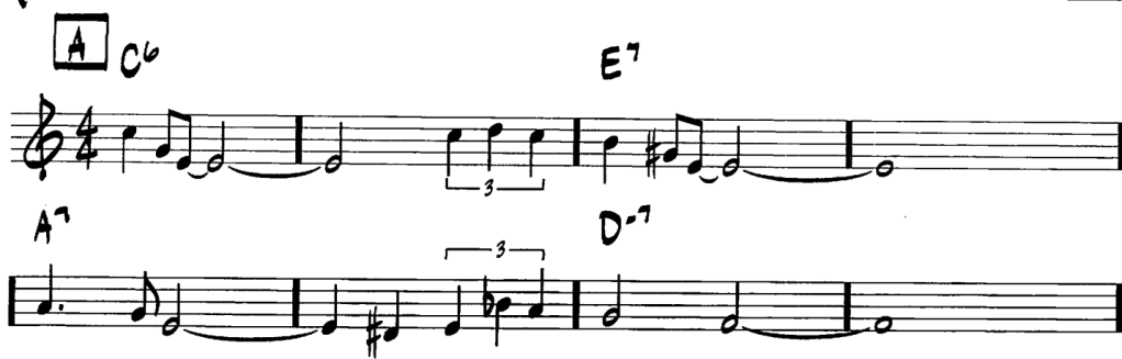 All of Me by Simons and Marks (key: C major) – Bars 3-7, a train of secondary dominants. E7 (V7/vi) takes us to vi played as A7 (V7/ii) which takes us to ii (Dm7).